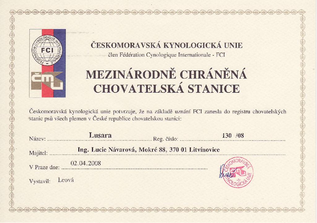 Adresa: Mokré 88, 3700 Litvínovice Telefon: +420777568013 Zodpovědná osoba: Ing. Lucie Návarová www: www.lusara.cz Mail: | Reg. číslo CHS: 130/08 Certifikát CHS: Zobrazit Certifikát ::: Plánujeme vrh: 05.03.2012 Hodnocení: 90 bodů ze 100 |
